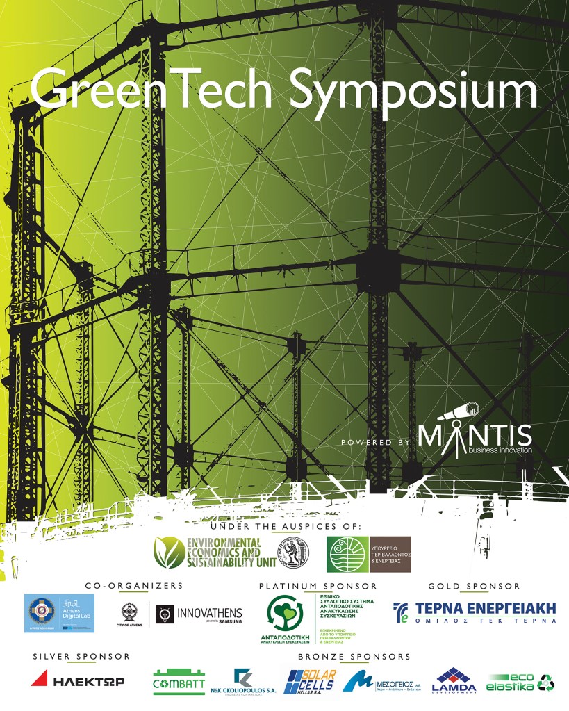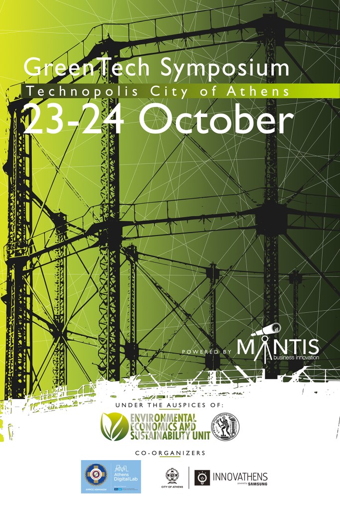 The GreenTech Symposium took place at Technopolis / Gazi*, which is why I used the structure of the Gas Holder combined with a green network on the background [also used for Startup Now Forum which was co-organized with GreenTech Symposium] Το GreenTech Symposium πραγματοποιήθηκε στο Γκάζι/Τεχνόπολις απ’όπου και η ιδέα για τη χρήση τμήματος του Αεριοφυλακίου σε συνδιασμό με το δίκτυο στο φόντο, που χρησιμοποιήθηκε και στο Startup Now Forum που είχε διοργανωθεί μαζί με το GreenTech Symposium.