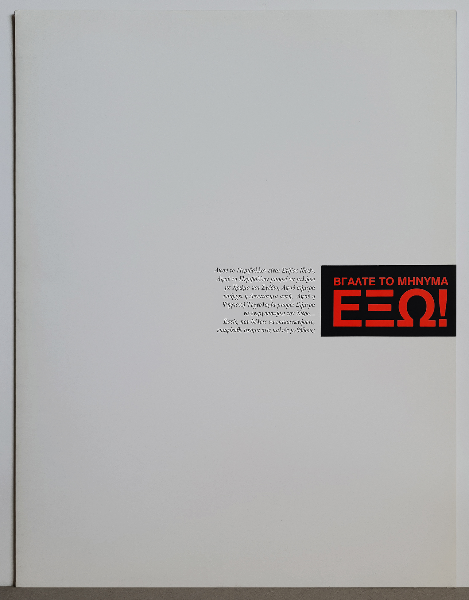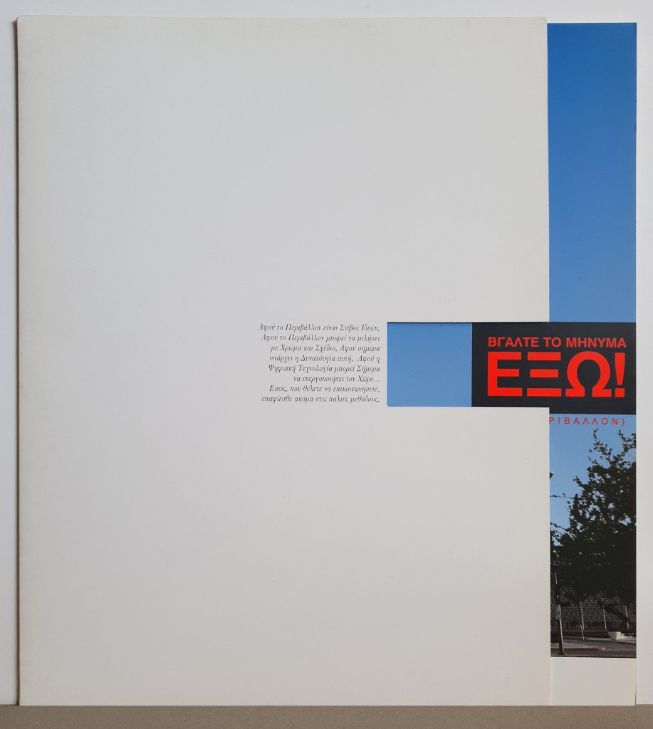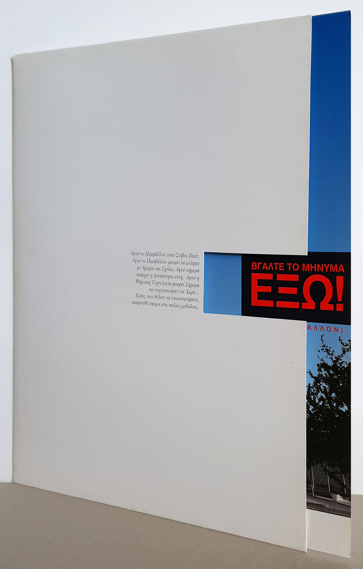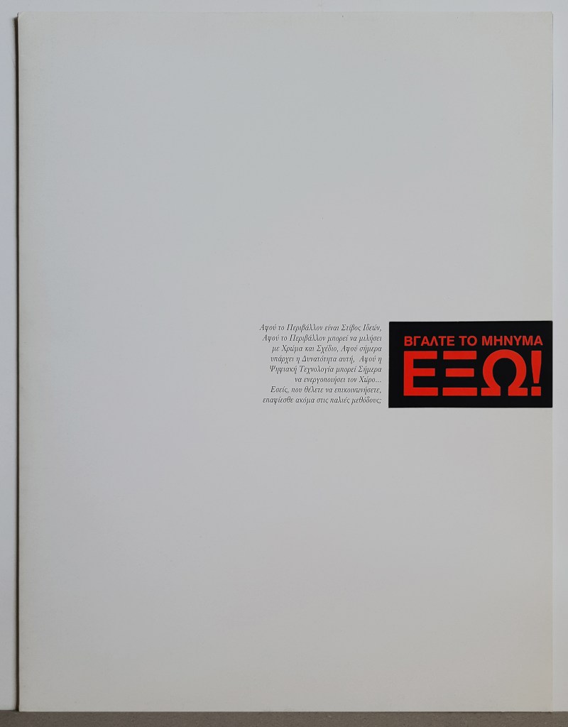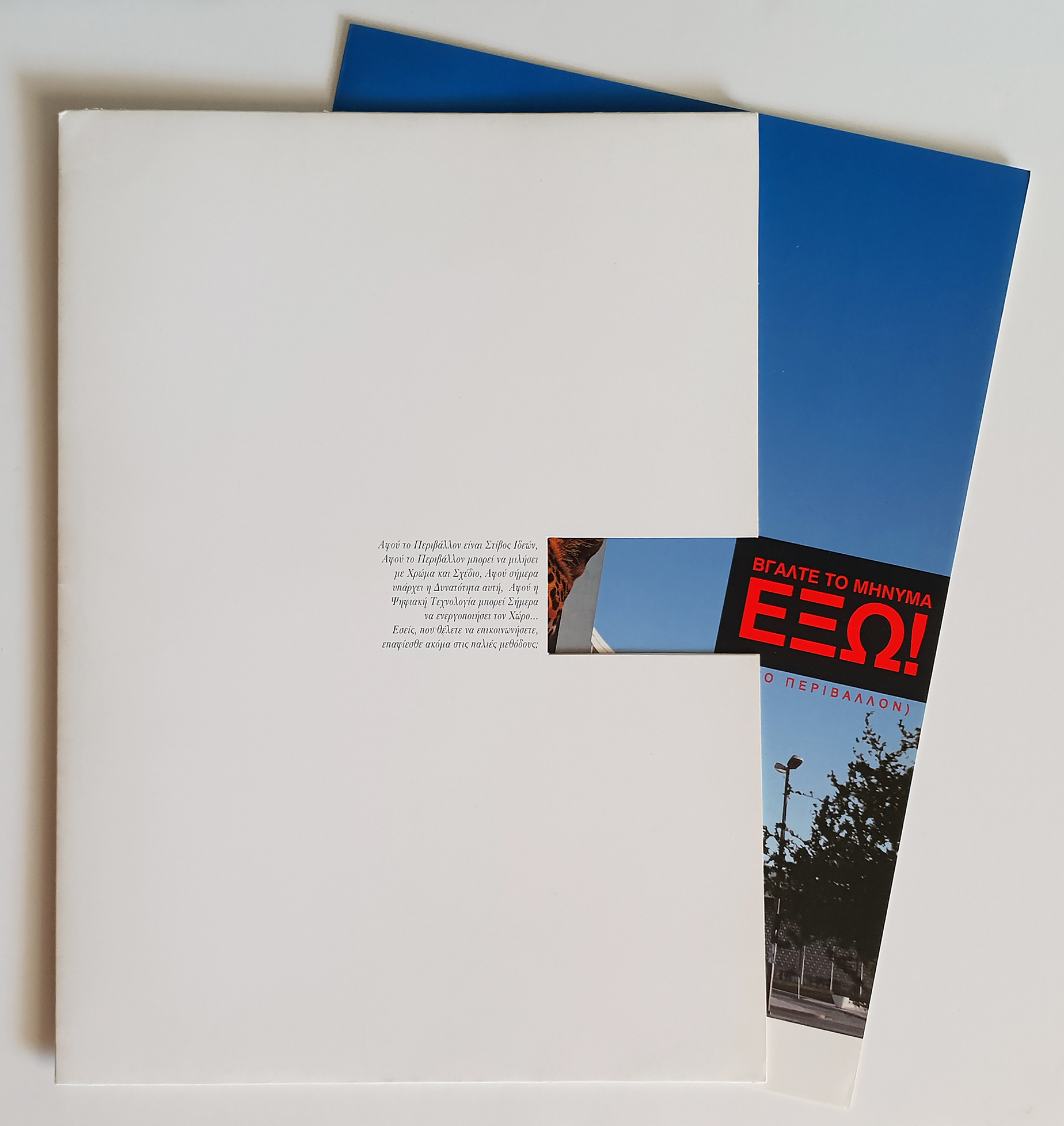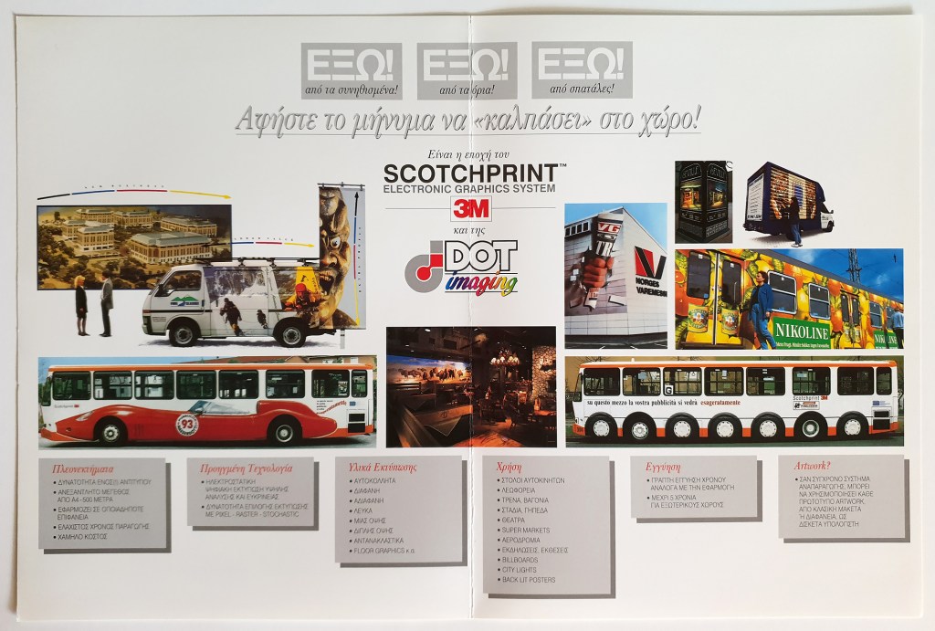 Folder & brochure for Dot Imaging, digital printing company. Our slogan “Get the message OUT!” was the idea behind the pullout brochure. The company does large scale print on various surfaces hence our idea of creating an image of a leopard emerging from the Athens Hilton! • Φάκελλος/folder και έντυπο σχεδιασμένα για την Dot Imaging, πρωτοπόρο τότε, που είχε ξεκινήσει την ψηφιακή εκτύπωση μεγάλου μεγέθους. Το εύγλωττο σλόγκαν μας “Βγάλτε το μήνυμα ΕΞΩ!” ήταν και η ιδέα πίσω απ’το παραλληλόγραμμο κόψιμο του φακέλλου απ’το οποίο τραβιέται έξω το έντυπο. Για να προωθήσουμε τις τεχνικές της εταιρίας, δημιουργήσαμε την εικόνα μίας λεοπάρδαλης να βγαίνει μέσα από το Hilton.