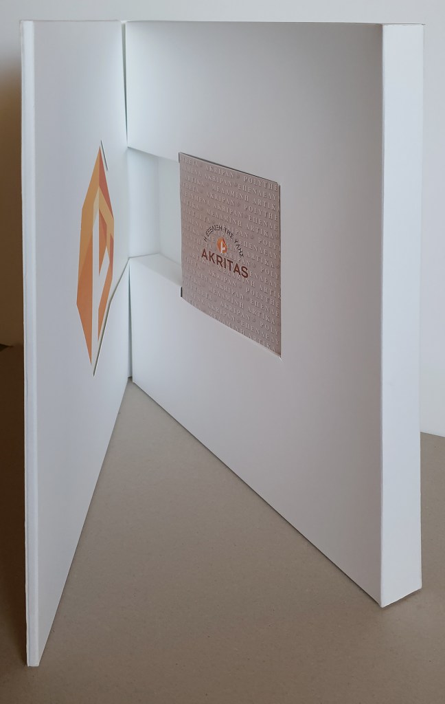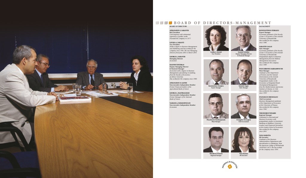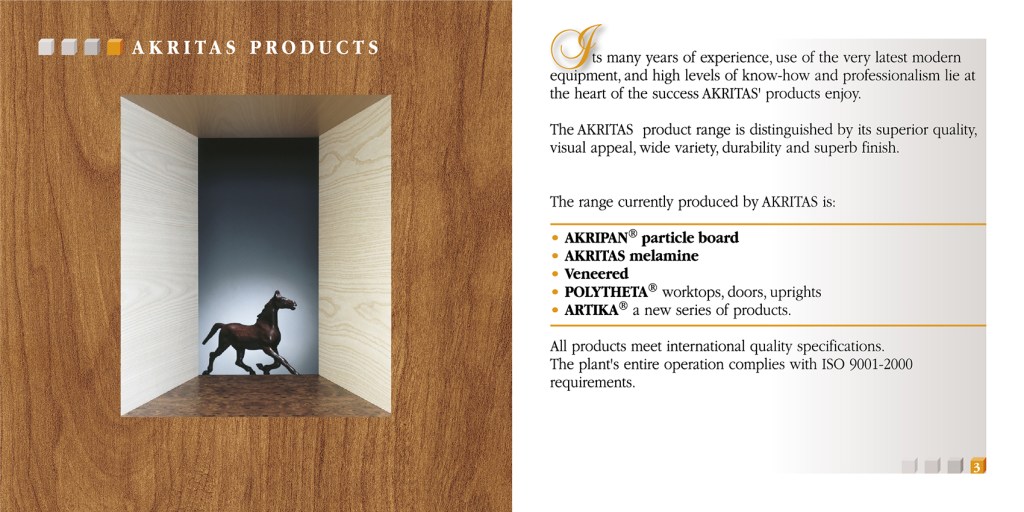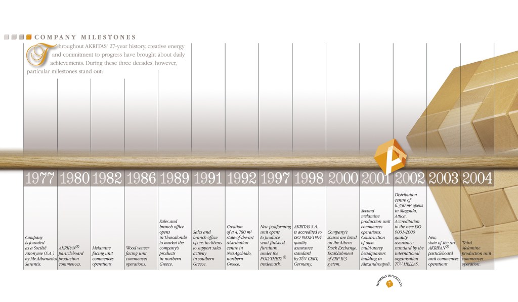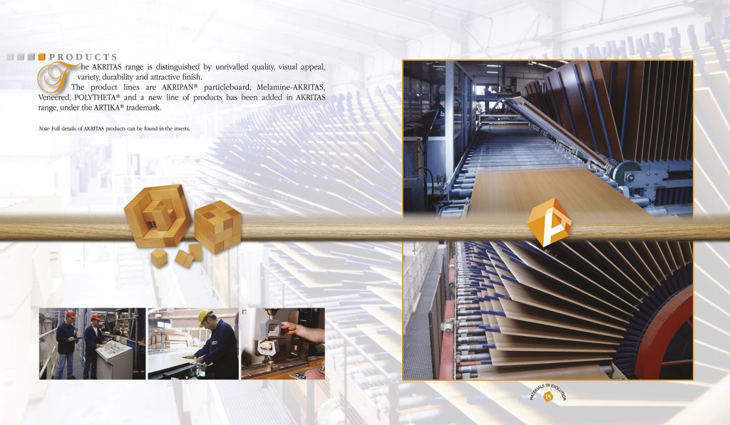 A project comprising of many aspects. One folder with a brochure about the company, a small 16 page brochure with the products and 5 coasters with samples of woods. A challenging project for everyone involved, designer and printer, as this folder had to hold the coasters and the small brochure on one side [right] and on the left side, a pocket with a cutout in the shape of the company logo for the company brochure. The slogan “Materials in Evolution” and logo, were embossed on the cover of the brochure. Greek and English Edition. Projects like these are always enjoyable to work on. • Μία εργασία με πολλαπλές προκλήσεις. Ενα folder, που περιέχει μία μπροσούρα της εταιρίας, ένα 16σέλιδο εντυπάκι με τα προϊόντα της και 5 σουβέρ με δείγματα ξύλου. Δύσκολο εγχείρημα και σχεδιαστικά και εκτυπωτικά. Το folder έπρεπε να κρατάει τα σουβέρ και το μικρό εντυπάκι [δεξιά] και αριστερά έπρεπε να υπάρχει θήκη με κοπτικό το σχήμα του λογοτύπου της εταιρίας, για να μπαίνει η μπροσούρα. Το σλόγκαν “Η Εξέλιξη τηε Υλης” και το λογότυπο είναι ανάγλυφα στο εξώφυλλο της μπροσούρας. Ελληνική και Αγγλική έκδοση. Τέτοια πρότζεκτ είναι πάντα ευχάριστα.