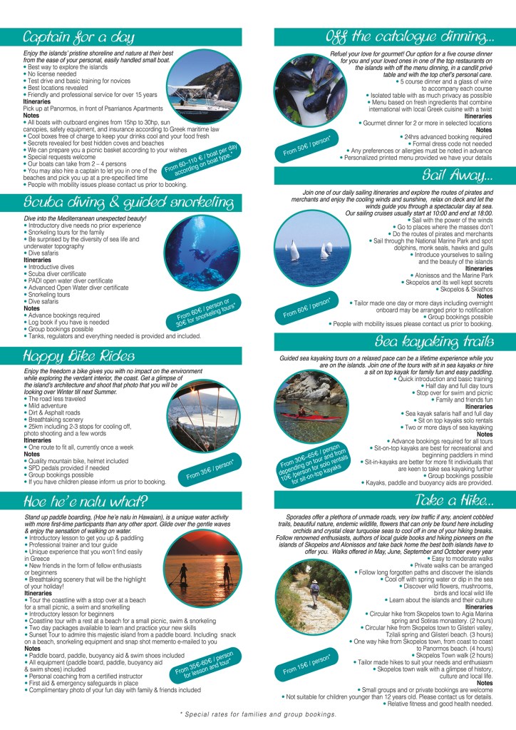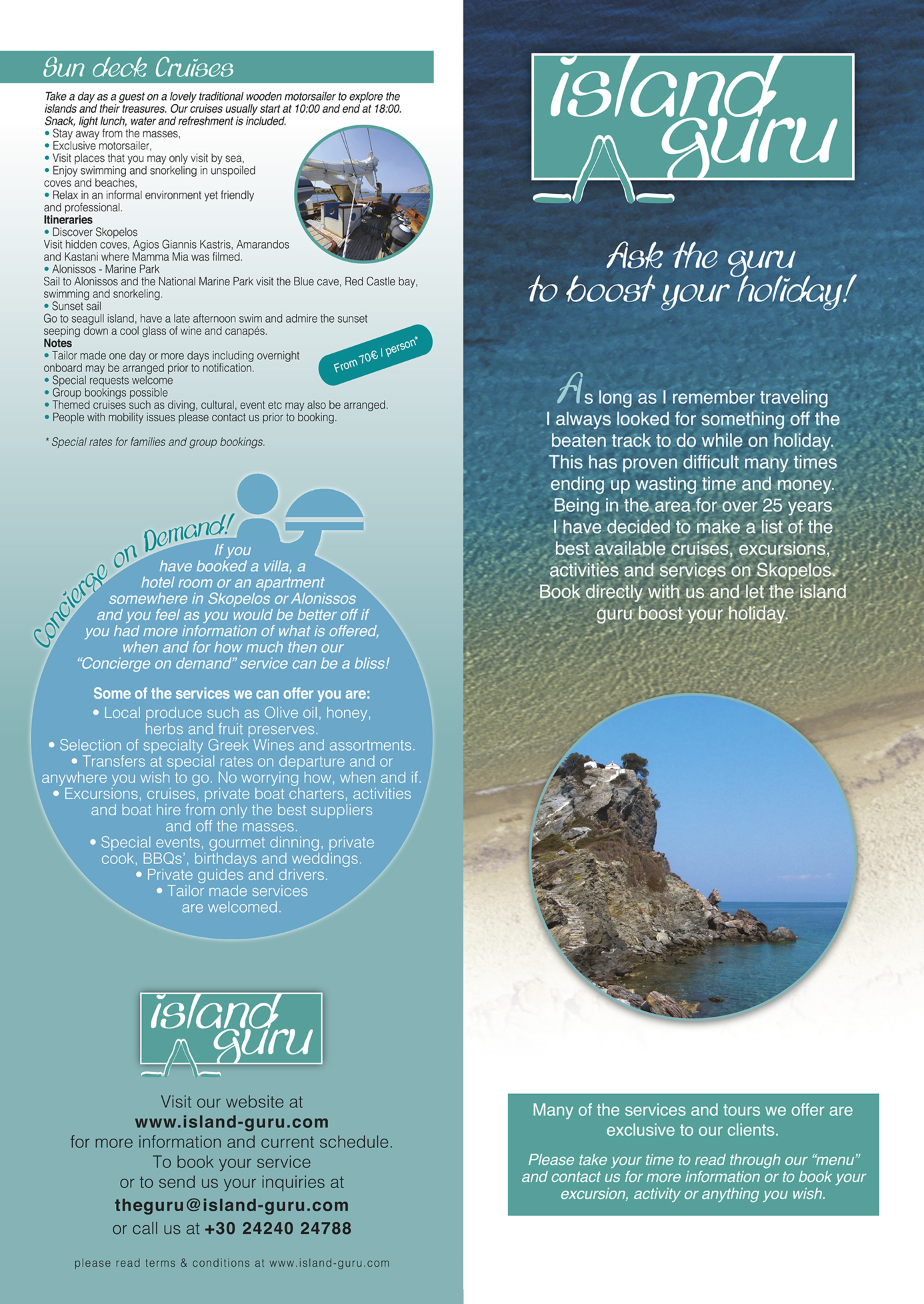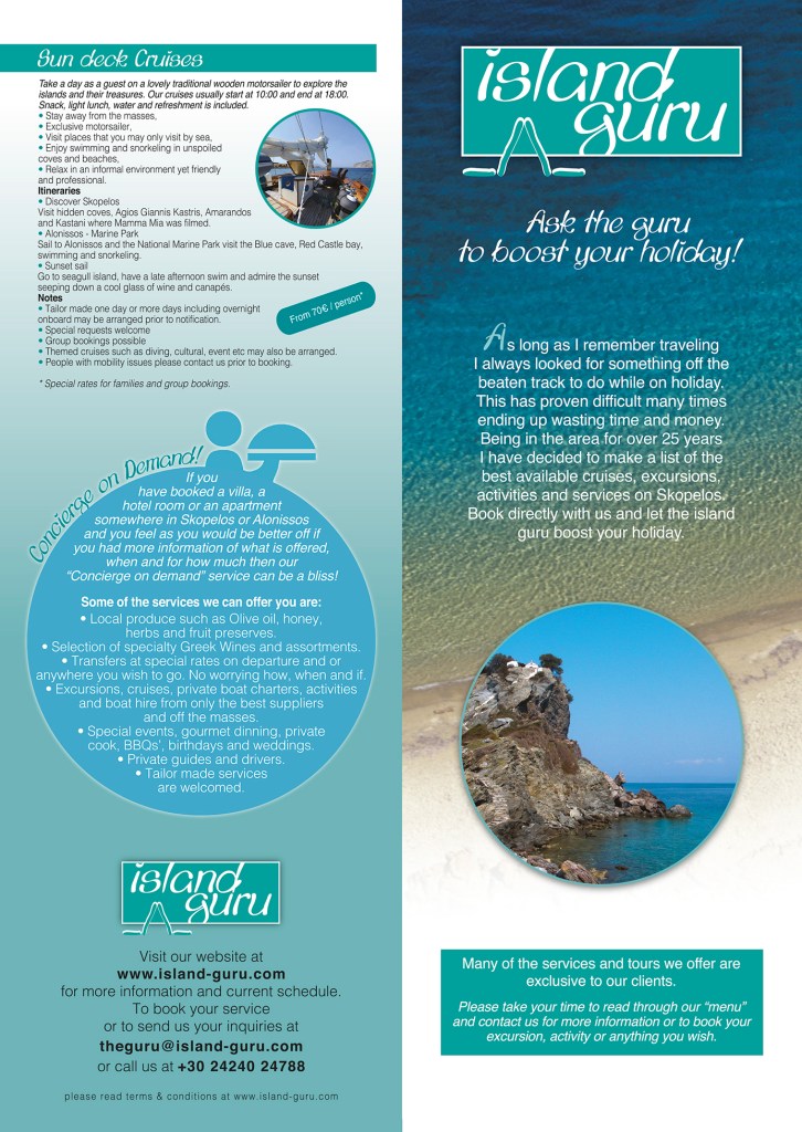 4 page leaflet design for the Island Guru. I distinctly remember having cheerful thoughts reading about all those things one can do while on vacation, so there are many smiles embedded in that leaflet! Σχεδιασμός 4 σέλιδου φυλλαδίου για το Island Guru. Θυμάμαι να σκέπτομαι όλες αυτές τις δυνατότητες που προσφέρονται στις διακοπές. Είναι σίγουρο οτι μέσα σε αυτό το φυλλάδιο εμπεριέχονται πολλά χαμόγελα!