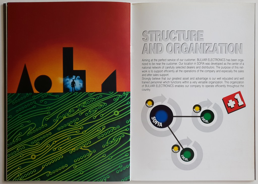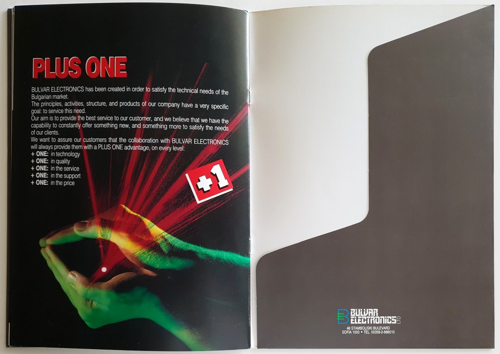 A 12 page + cover brochure with a pocket on the back cover for documents, for an electronics company based in Sofia. We chose to use the symbol of the company [B] only on the first opening as a cutout against a green background [circuit color] and use only the logotype on the cover, embossed. • 12 σέλιδη μπροσούρα με θήκη για έγγραφα στην πίσω όψη του οπισθόφυλλου. Επιλέξαμε να χρησιμοποιήσουμε το σύμβολο [logo – B] της εταιρίας μόνο στο εσωτερικό ‘αφτί’ / κοπτικό σε πράσινο φόντο [χρώμα τυπωμένων κυκλωμάτων] και στο εξώφυλλο να μπουν μόνο τα γράμματα του λογοτύπου, ανάγλυφα.