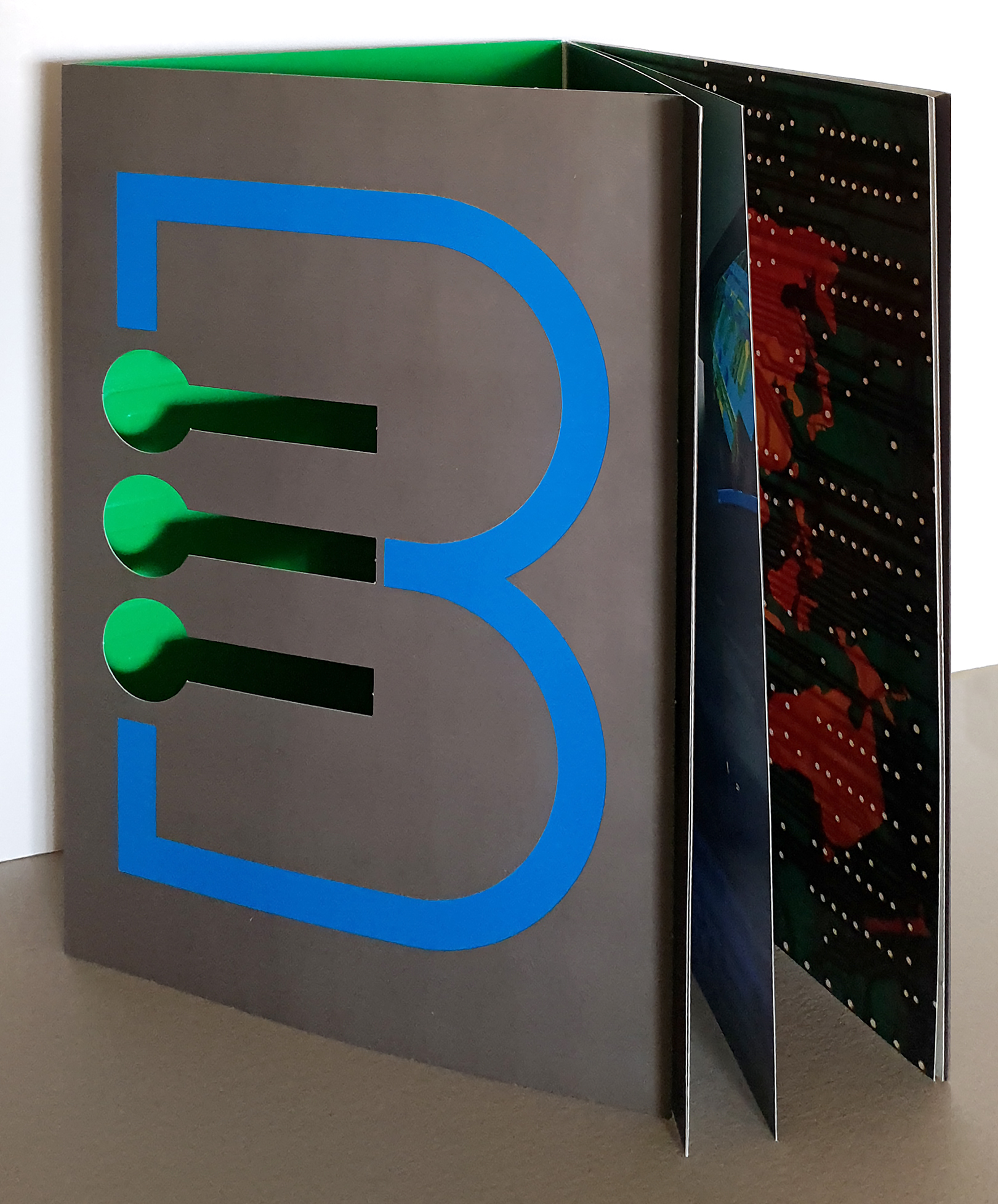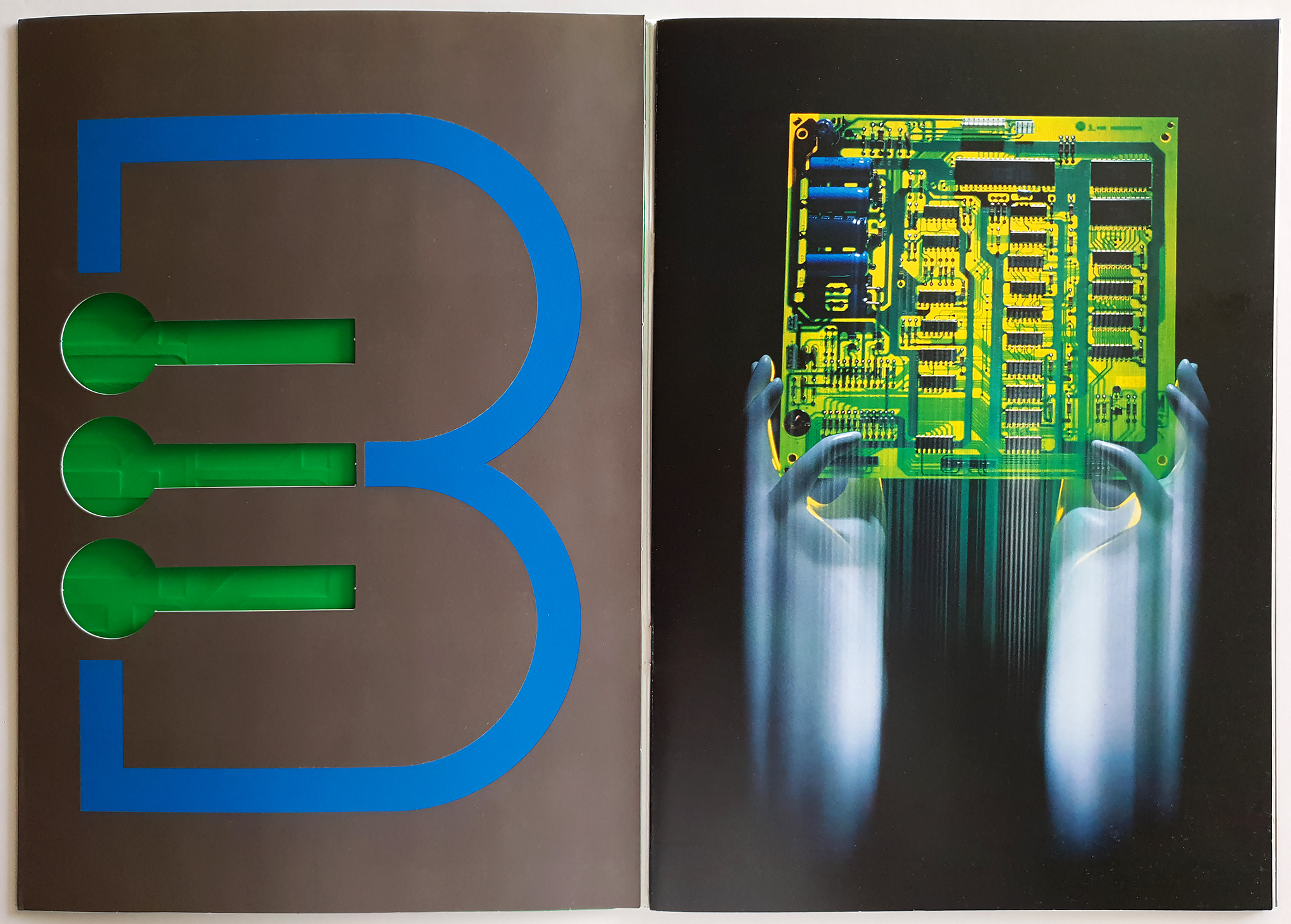 A 12 page + cover brochure with a pocket on the back cover for documents, for an electronics company based in Sofia. We chose to use the symbol of the company [B] only on the first opening as a cutout against a green background [circuit color] and use only the logotype on the cover, embossed. • 12 σέλιδη μπροσούρα με θήκη για έγγραφα στην πίσω όψη του οπισθόφυλλου. Επιλέξαμε να χρησιμοποιήσουμε το σύμβολο [logo – B] της εταιρίας μόνο στο εσωτερικό ‘αφτί’ / κοπτικό σε πράσινο φόντο [χρώμα τυπωμένων κυκλωμάτων] και στο εξώφυλλο να μπουν μόνο τα γράμματα του λογοτύπου, ανάγλυφα.