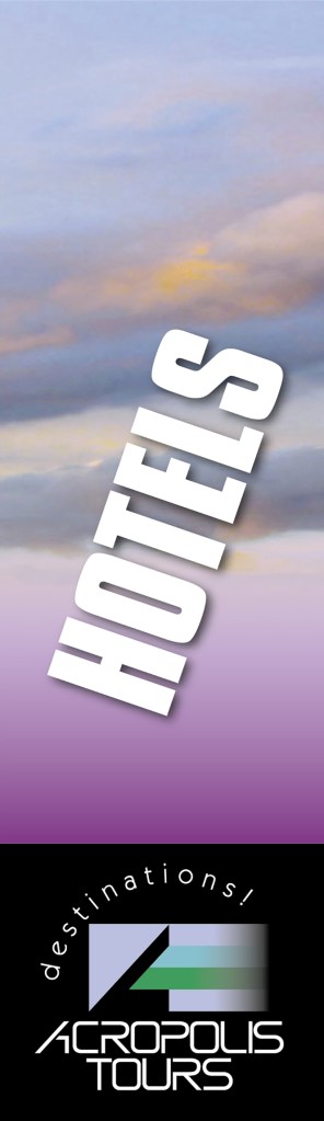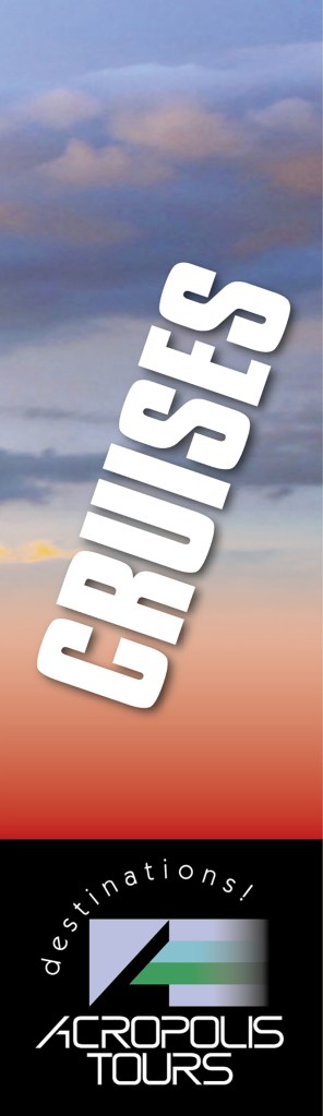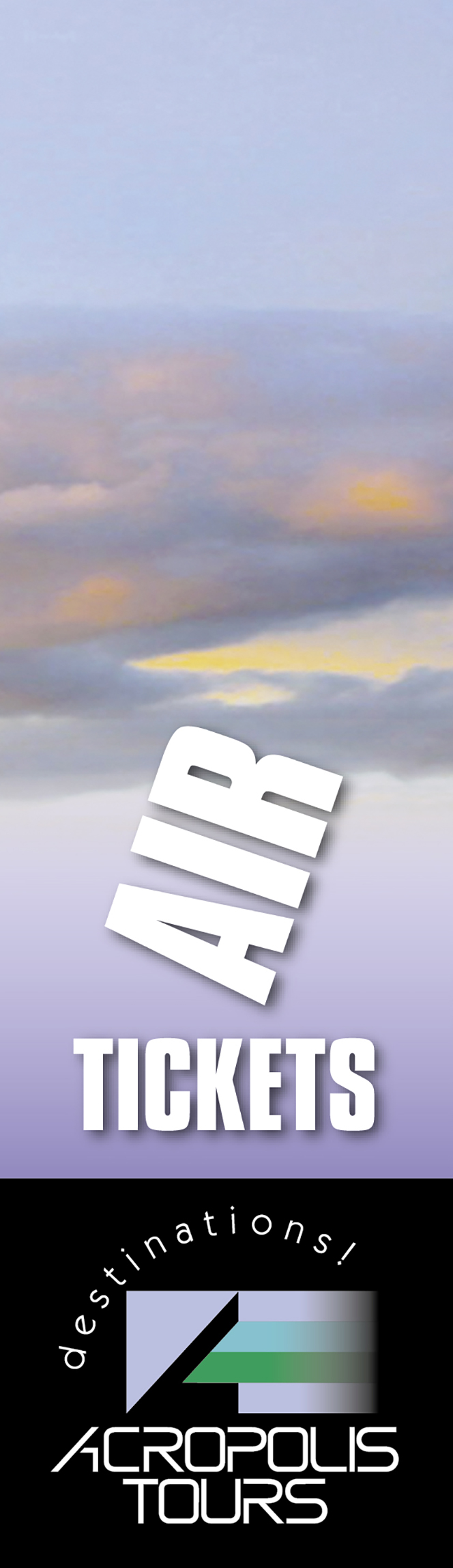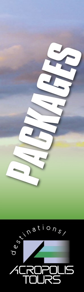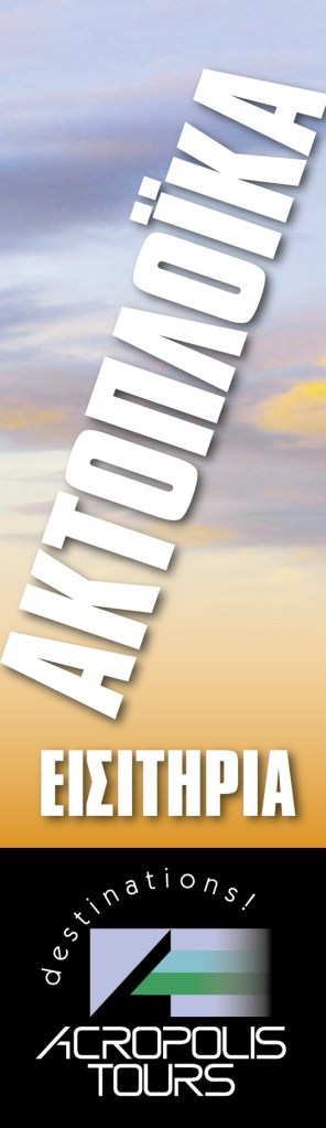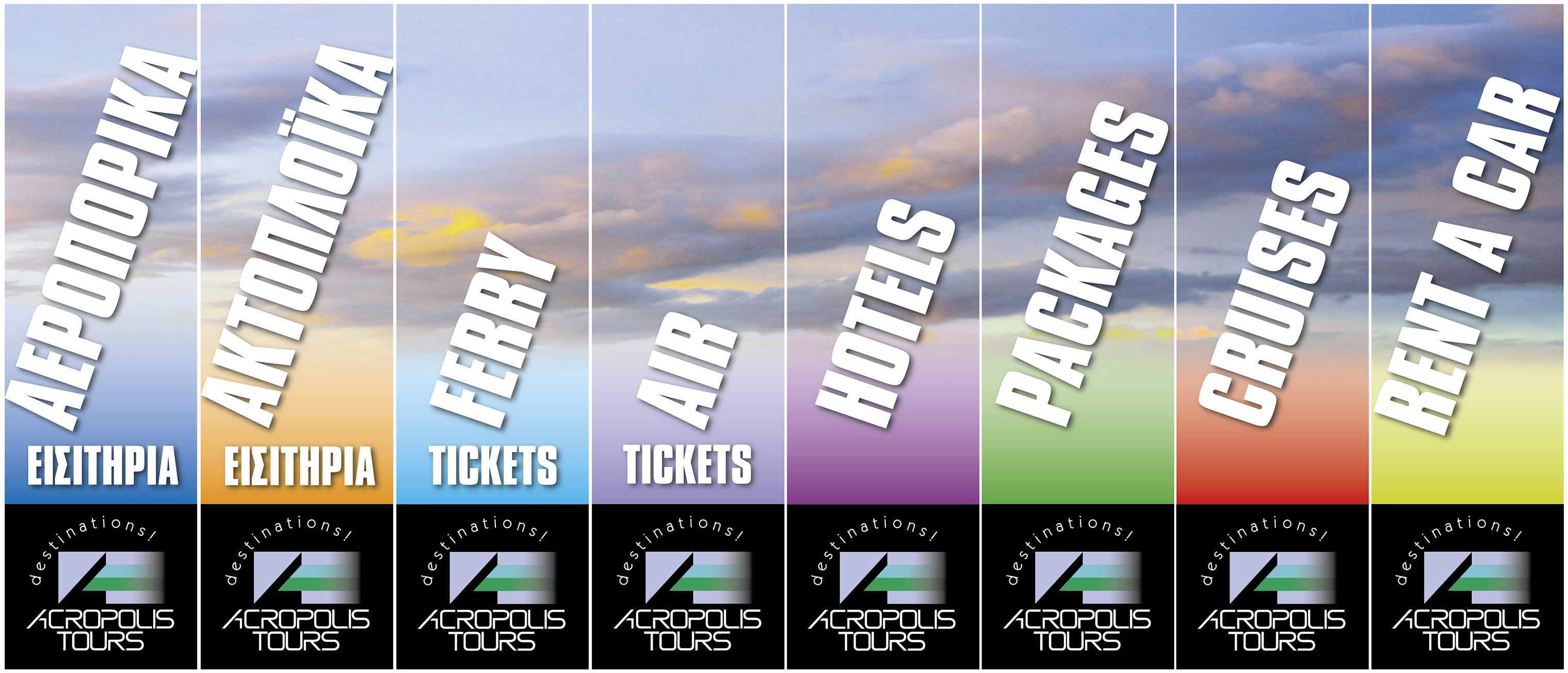 8 banners designed for a travel agency. 8 separate banners that are part of one image. Αs they appear on the building they seem as one, with the wind adding movement to the image. • 8 πανώ σχεδιασμένα για τουριστικό γραφείο. 8 ξεχωριστά πανώ, που αποτελούν μέρος μίας εικόνας. Ετσι όπως εμφανίζονται στο κτίριο, μοιάζουν να είναι μία εικόνα, με τον αέρα να τους δίνει κίνηση.