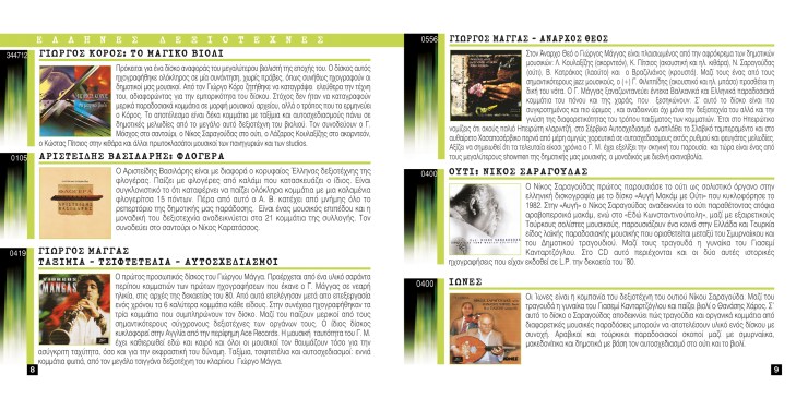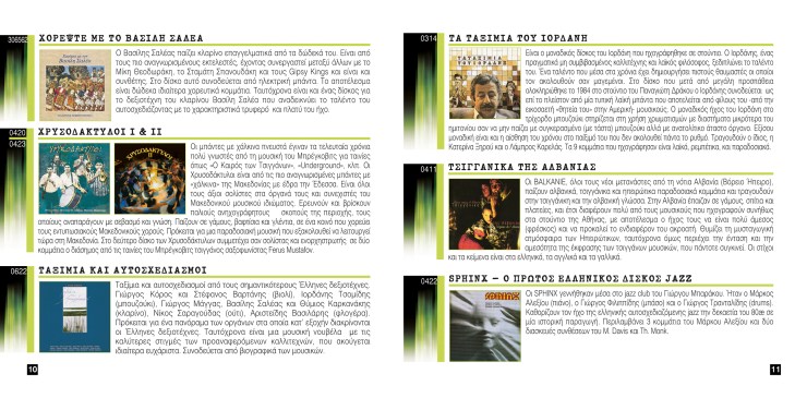 A 14 page brochure for a record label catalogue. Different color divisions were used for the distinction of genres. Κατάλογος 14 σελίδων για δισκογραφική εταιρεία. Τα διαφορετικά είδη χωρίζονται με διαφορετικά χρώματα.