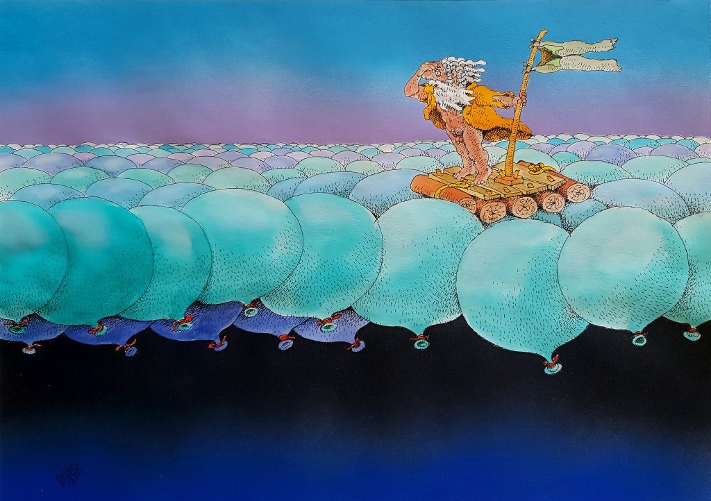 I felt that the following explanations were necessary for the understanding of the seriousness of the subject that unfolds in the pages of this book. Babiniotis dictionary refers to the word Pomfolygas, as words empty of content, silly chatter, babble, chatter, nonsense, gibberishm, balderdash, blather. However, the entry “Pomfos” is interpreted as “any kind of blister on the skin, which is not due to serious pathological causes”. The balloons, which I called “Pomfolyges”, hover in the paradox of their own etymology. They have resulted from a pathological process that I have to put to the test: Multiple infection developed blisters on my central nervous system, which very quickly spread to the skin and then were detached and filled the space. I have tried, as a meticulous scientist, to closely monitor the symptoms of the disease. I recorded them. So I deliver these images for the use of intelligent scholars, who will deal more systematically and possibly solve the clinical mystery: how blisters of an infection turned into empty content and nonsense. I must also add a syndrome that should not be concealed: In the terminal stages the patient [e.g. me] is occupied by an obsessive tendency to “bubblize” everything that falls under his attention. Finally there is a feeling of being surrounded by balloons, bubbles, blisters, blisters, bubbles, puffs, which in turn enclose everything. A light and yet unbearable world. [Ref. literature by Dr. Milan Kundera]