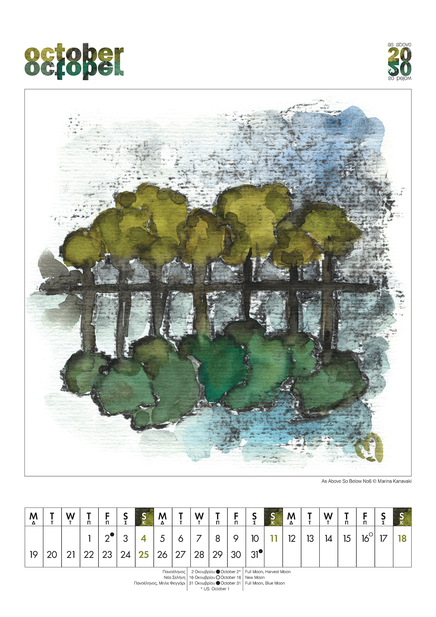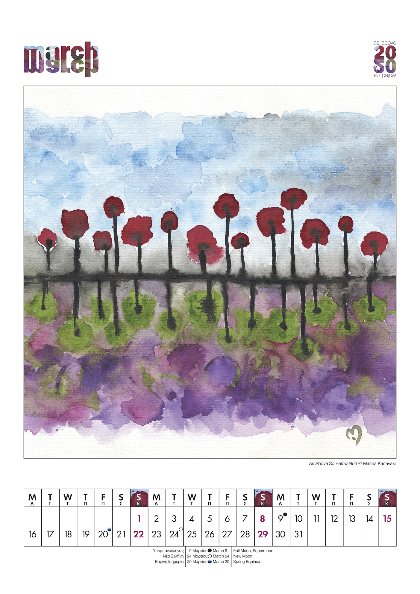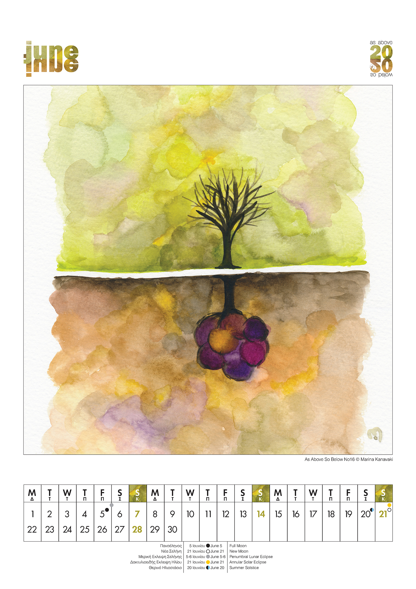 A 14 page wall calendar with a series of watercolors inspired by the Oneness of “As Above So Below”. Trees, Duality Trees, Inverted Trees reflections, dreamscapes, paths, in search of their fulfillment. Επίστοιχο ημερολόγιο 14 φύλλων με σειρά από ακουαρέλες εμπνευσμένη από την Ολότητα του “Οπως Πάνω Ετσι και Κάτω”. Δέντρα, δυαδικά δέντρα, αντεστραμμένα δέντρα αντανακλάσεις, ονειρικά τοπία, μονοπάτια, σε αναζήτηση της ολοκλήρωσής τους.