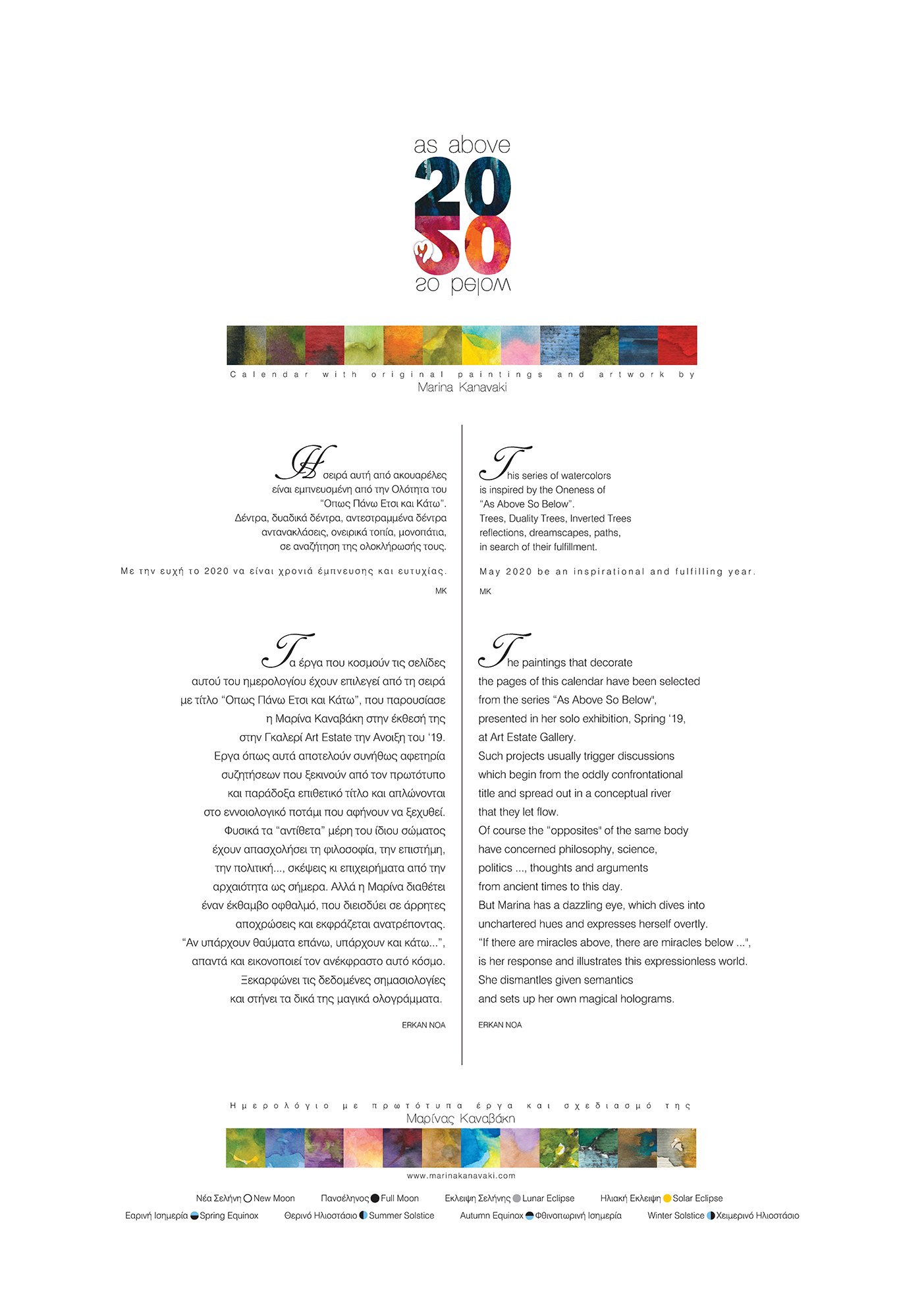A 14 page wall calendar with a series of watercolors inspired by the Oneness of “As Above So Below”. Trees, Duality Trees, Inverted Trees reflections, dreamscapes, paths, in search of their fulfillment. Επίστοιχο ημερολόγιο 14 φύλλων με σειρά από ακουαρέλες εμπνευσμένη από την Ολότητα του “Οπως Πάνω Ετσι και Κάτω”. Δέντρα, δυαδικά δέντρα, αντεστραμμένα δέντρα αντανακλάσεις, ονειρικά τοπία, μονοπάτια, σε αναζήτηση της ολοκλήρωσής τους.