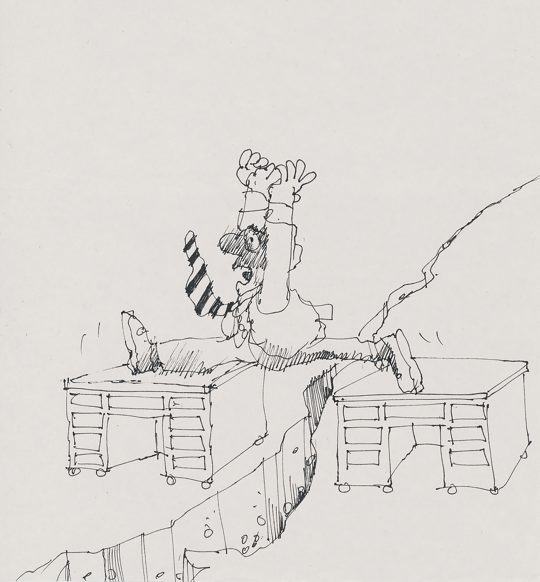 Αλλο ένα από τα σκίτσα που ονομάζω “παράπλευρα …αποκτήματα”, τα οποία συνήθως γινόντουσαν την ώρα ενός τηλεφωνήματος, ή καθώς ετοιμαζόταν η ιδέα για κάποιον πελάτη, ή περίμενοντας το επόμενο άρθρο για εικονογράφηση…