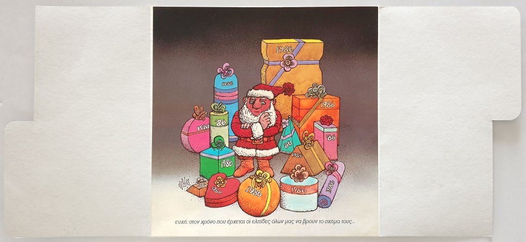 Card artwork for our design center [pre Anmar: Schima] with original cartoon by A. Kanavakis. The two triangles on the cover [Schima logo] are a mirror. • Σχεδιασμός κάρτας για το δημιουργικό μας κέντρο [προ Anmar: Σχήμα], με πρωτότυπο σκίτσο του Α. Καναβάκη. Τα δύο τρίγωνα του λογοτύπου [Σχήμα] στο εξώφυλλο είναι καθρέπτης.