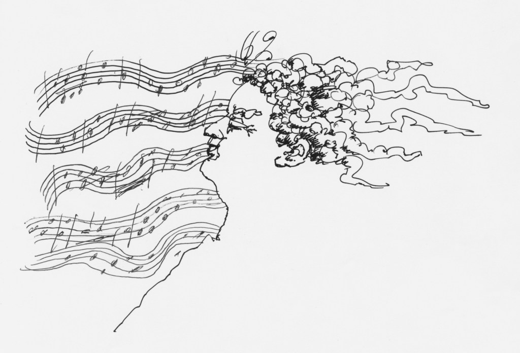 ✻Αυτό ήταν ένα γρήγορο σκίτσο που έγινε την ώρα που η Καμεράτα του Χατζιδάκι έκανε πρόβα. Οταν το είδε ο Χατζιδάκις ενθουσιάστηκε τόσο πολύ, που το έβαλε στο πρόγραμμα της συναυλίας.
