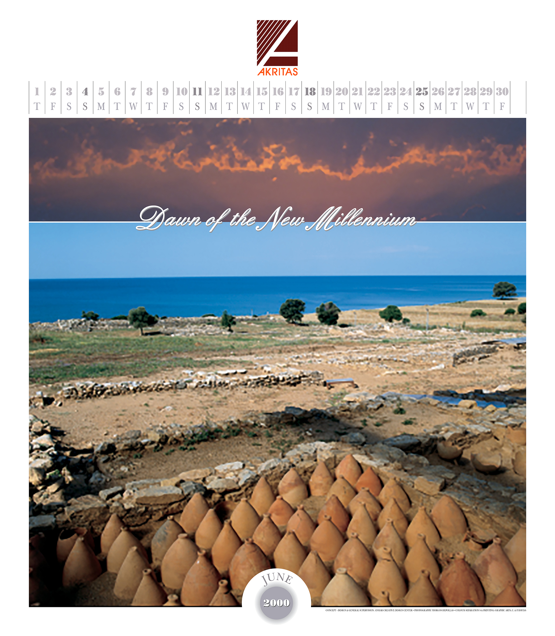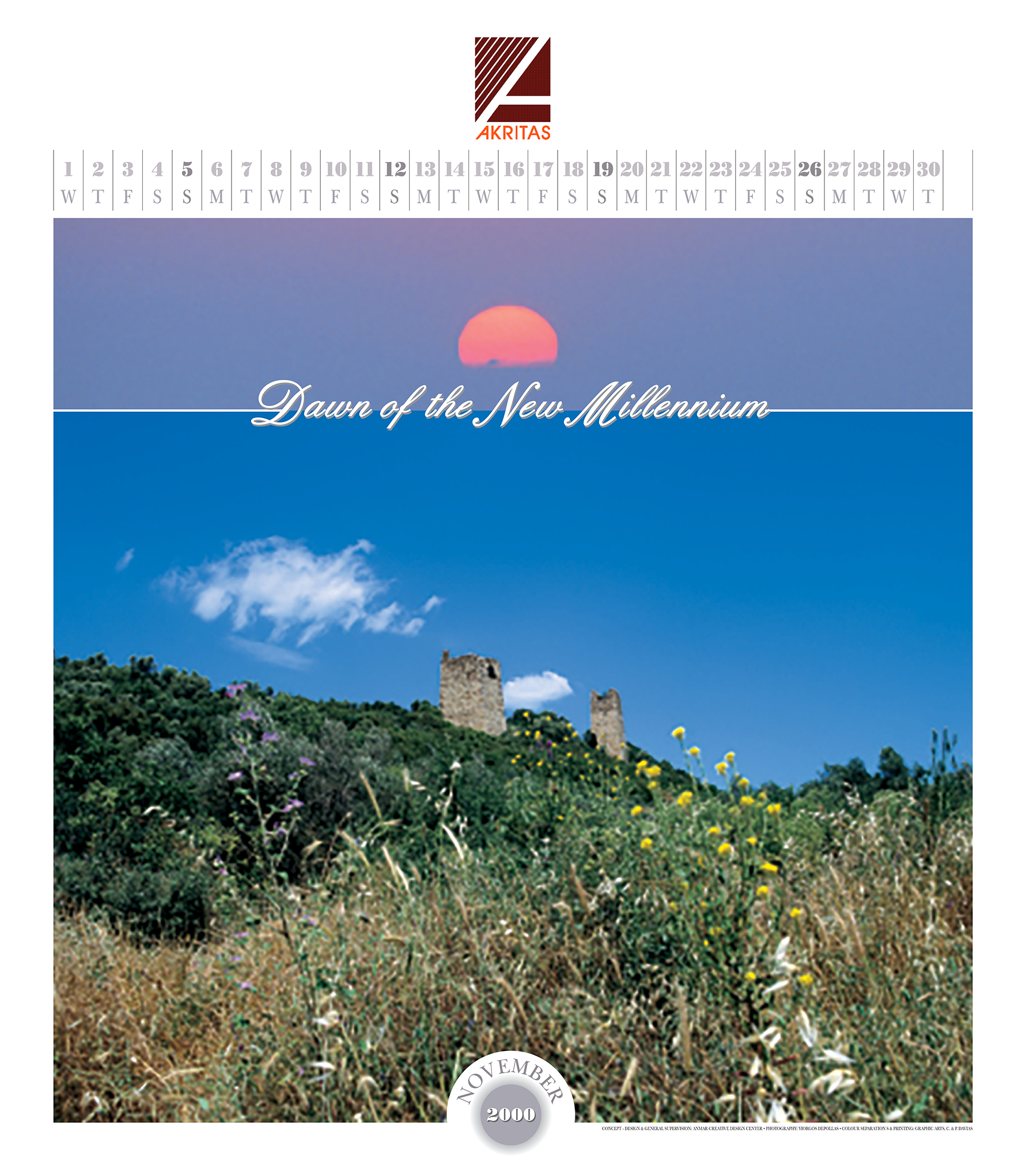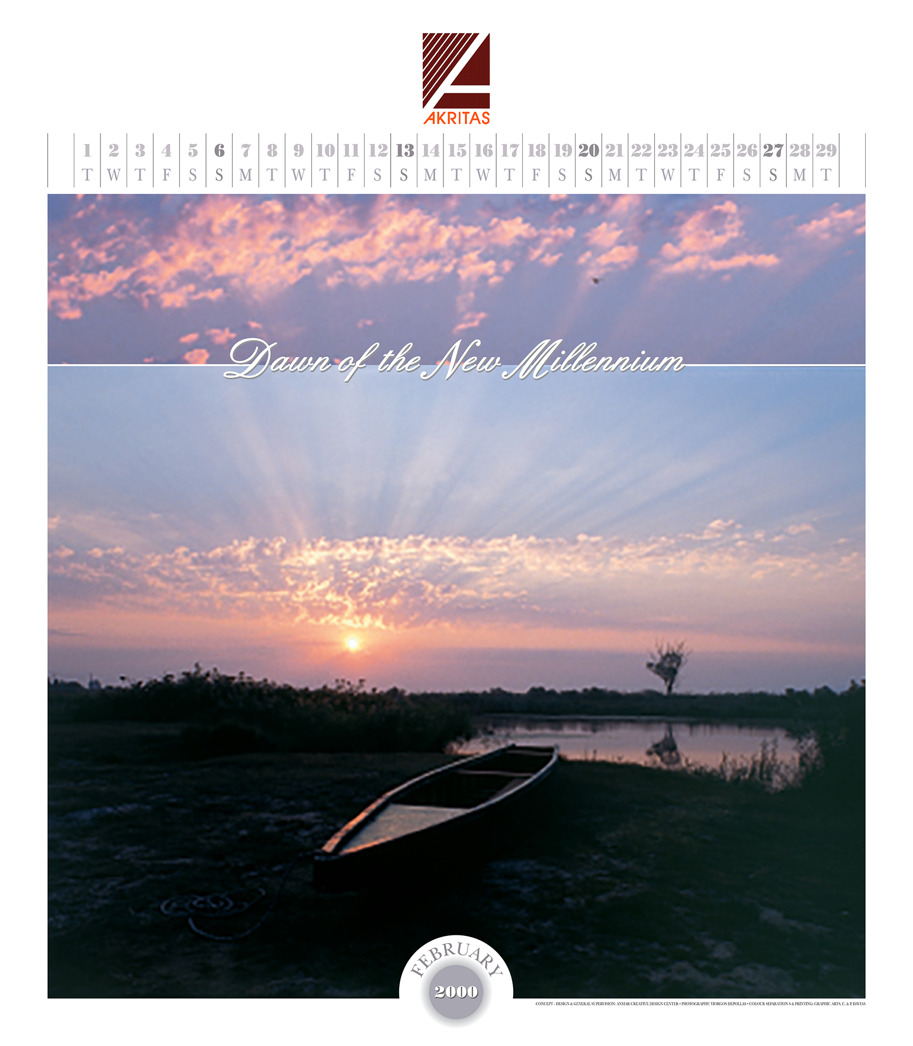 A 14 page wall calendar [48x55cm]. The photographs of the calendar depict mornings of July, August and September during our succesive drives on the land with starting-point Alexandroupolis. Landmarks in our course were Evros, from its delta to the northern part of its flow, other rivers like Erythropotamos and Ardas, areas like Dadia, Asproneri and the endless prairies, archaeological sites as those of Messimvria and Zoni, railway stations like Soufli, Didymoticho, Orestiada, Feres, castles like Avantas and, finally, amidst the sea the amazing world of Samothraki. Photographs taken by Giorgos Depollas. Unfortunately the photographs are low resolution. Back then we used photographic slides which were embedded in the printing process. • Επίστοιχο ημερολόγιο 14 φύλλων [48x55cm]. Οι φωτογραφίες του ημερολογίου απεικονίζουν πρωινά Ιουλίου, Αυγούστου και Σεπτεμβρίου κατά τη διάρκεια των διαδοχικών δρομολογίων μας στη στεριά με αφετηρία την Αλεξανδρούπολη. Ορόσημα στην πορεία μας ήταν ο Έβρος, από το δέλτα του μέχρι το βόρειο τμήμα της ροής του, άλλα ποτάμια όπως ο Ερυθροπόταμος και ο Άρδας, περιοχές όπως η Δαδιά, το Ασπρονέρι και τα ατελείωτα λιβάδια, αρχαιολογικοί χώροι όπως αυτοί της Μεσημβρίας και της Ζώνης, σιδηροδρομικοί σταθμοί όπως το Σουφλί, το Διδυμότειχο, Ορεστιάδα, Φέρες, κάστρα σαν τον Άβαντα και, τέλος, μέσα στη θάλασσα ο καταπληκτικός κόσμος της Σαμοθράκης. Οι φωτογραφίες είναι του Γιώργου Δεπόλα. Δυστυχώς η ανάλυση των φωτογραφιών είναι χαμηλή. Τότε χρησιμοποιούσαμε φωτογραφικά slides τα οποία μπαίναν στις μακέτες στο στάδιο των διαχωρισμών, πριν την εκτύπωση.