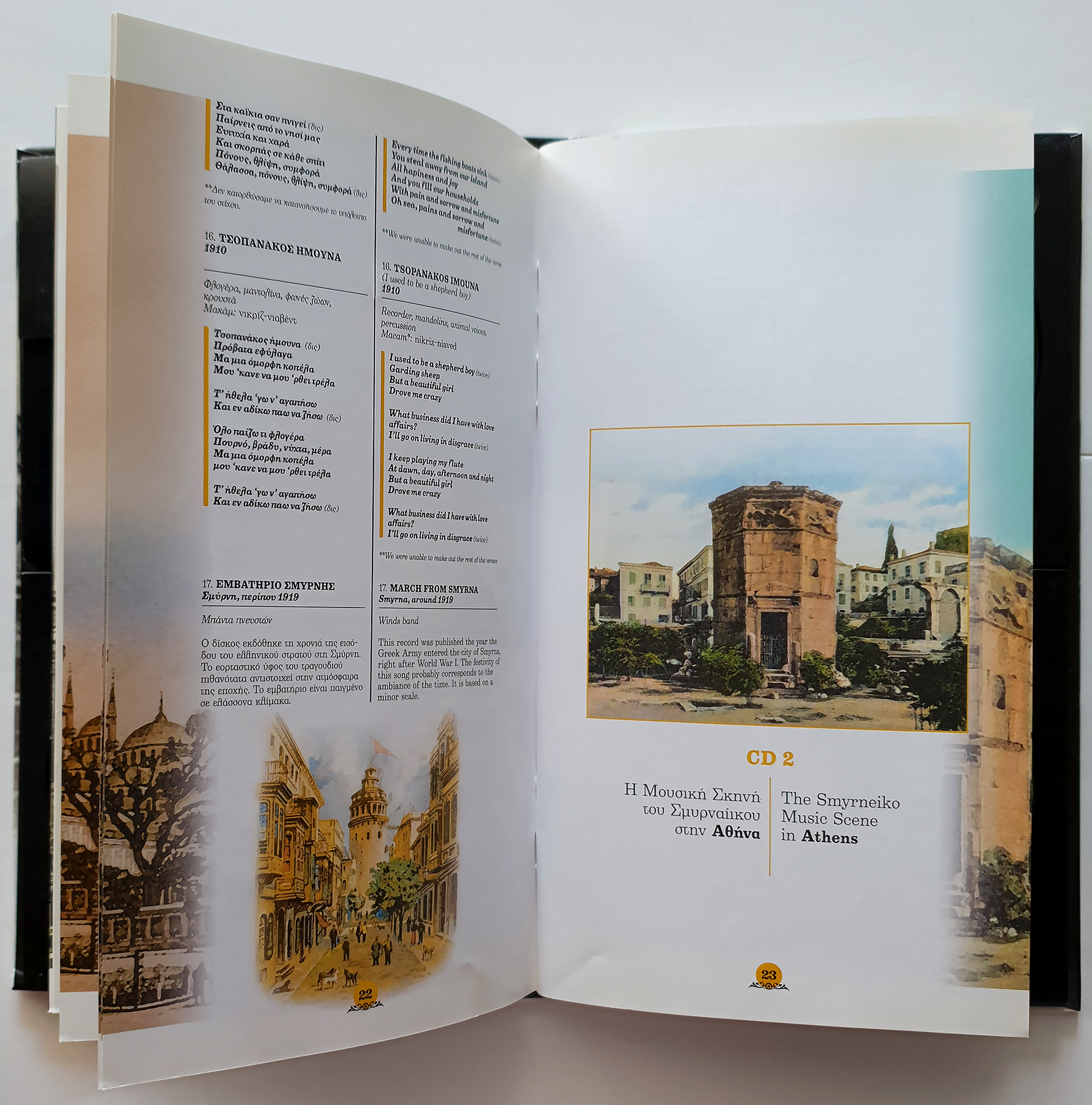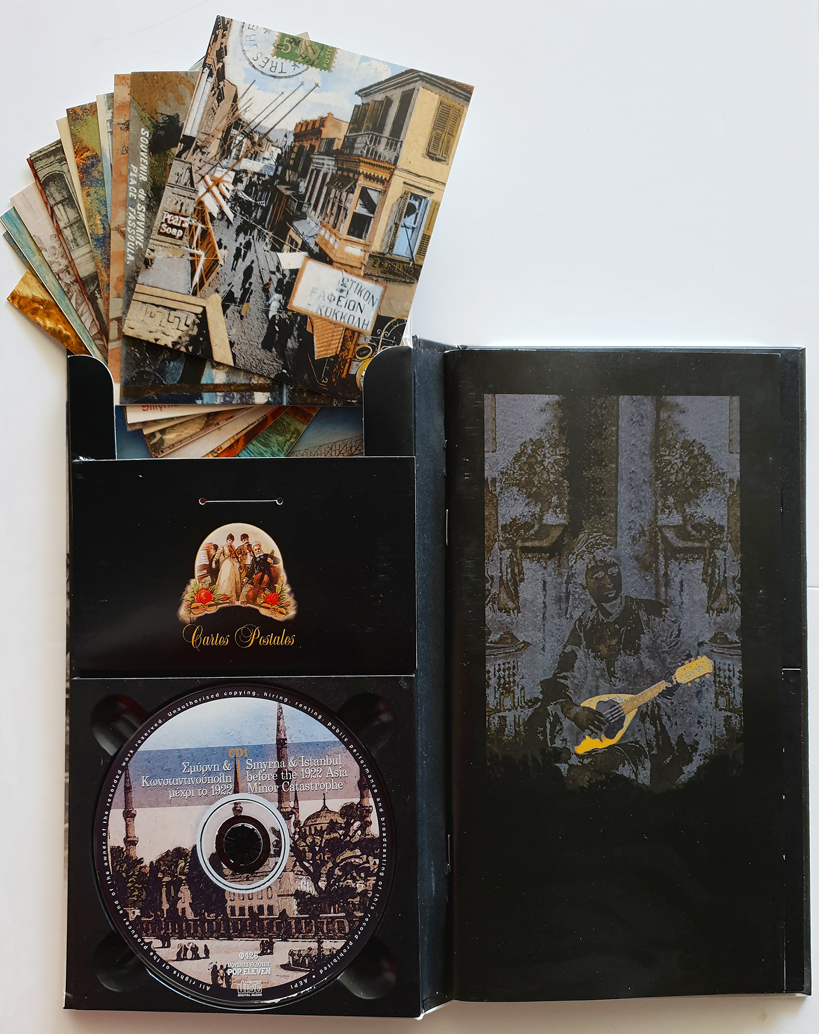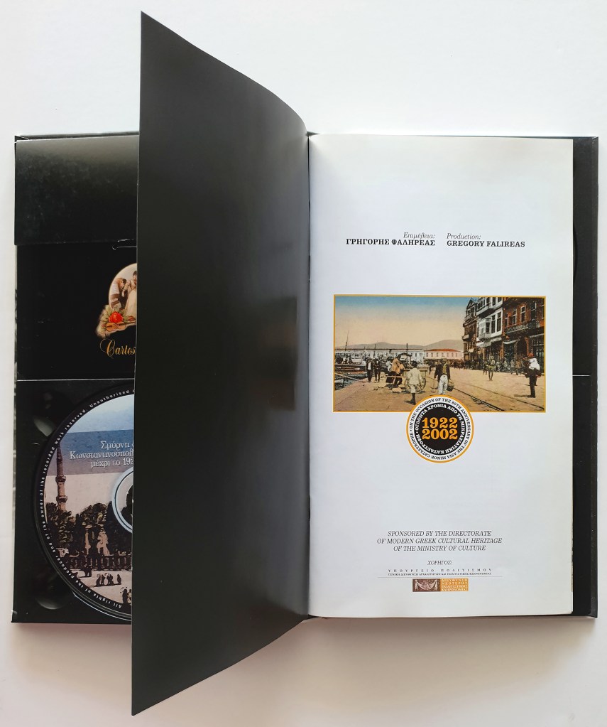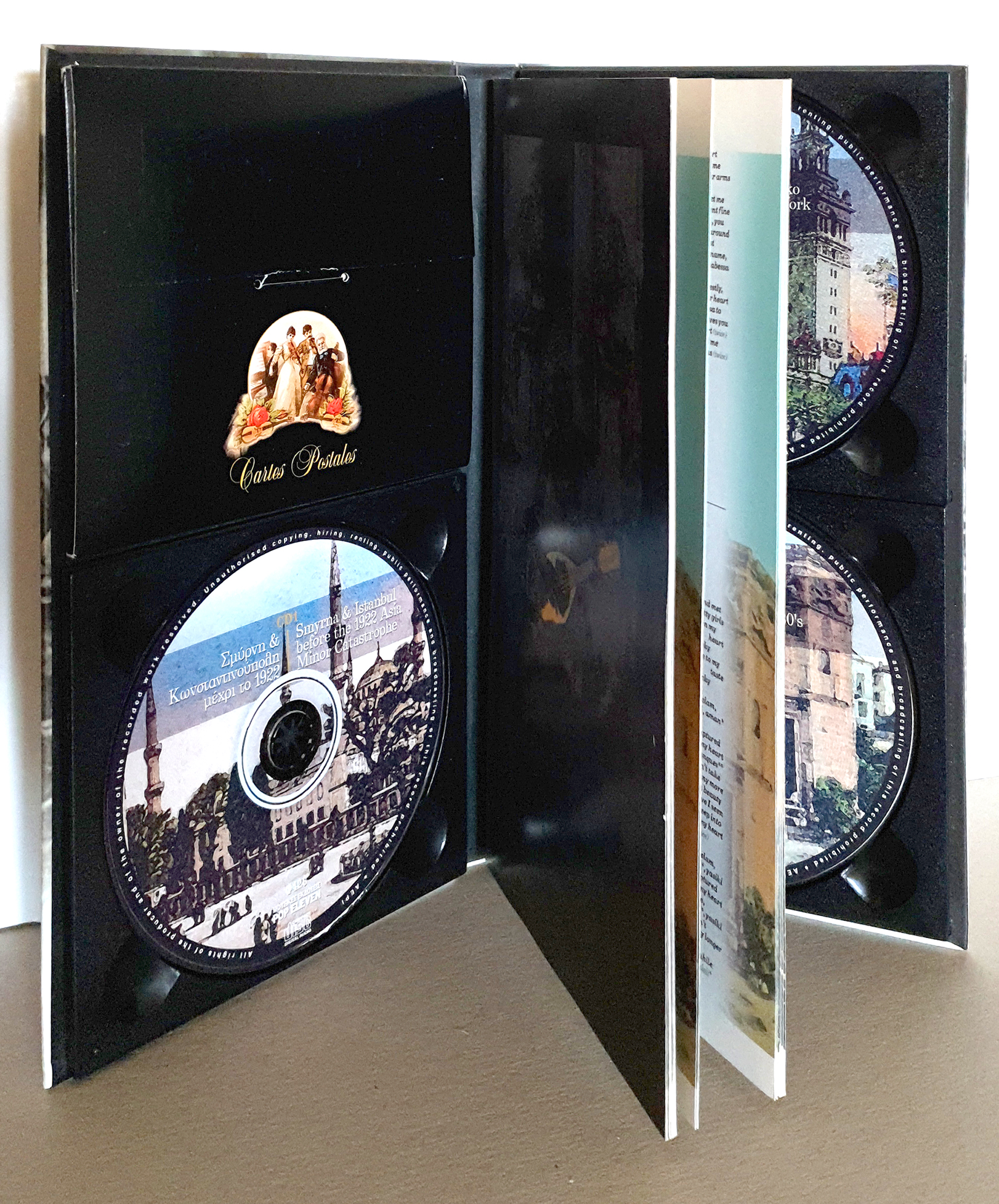 A luxury edition for a song collection that includes 3 cds, 14 rare postcards from Smyrna before 1922 and a 60 page booklet in both Greek and English. Title and details on the cover are printed in gold. A collector’s item. Σχεδιασμός έκδοσης για επετειακή συλλογή που περιλαμβάνει: 3 cds, 14 καρτ-ποστάλ της εποχής και ένα ένθετο 60 σελίδων σε δύο γλώσσες. Χρυσοτυπία στο εξώφυλλο. Συλλεκτικό.