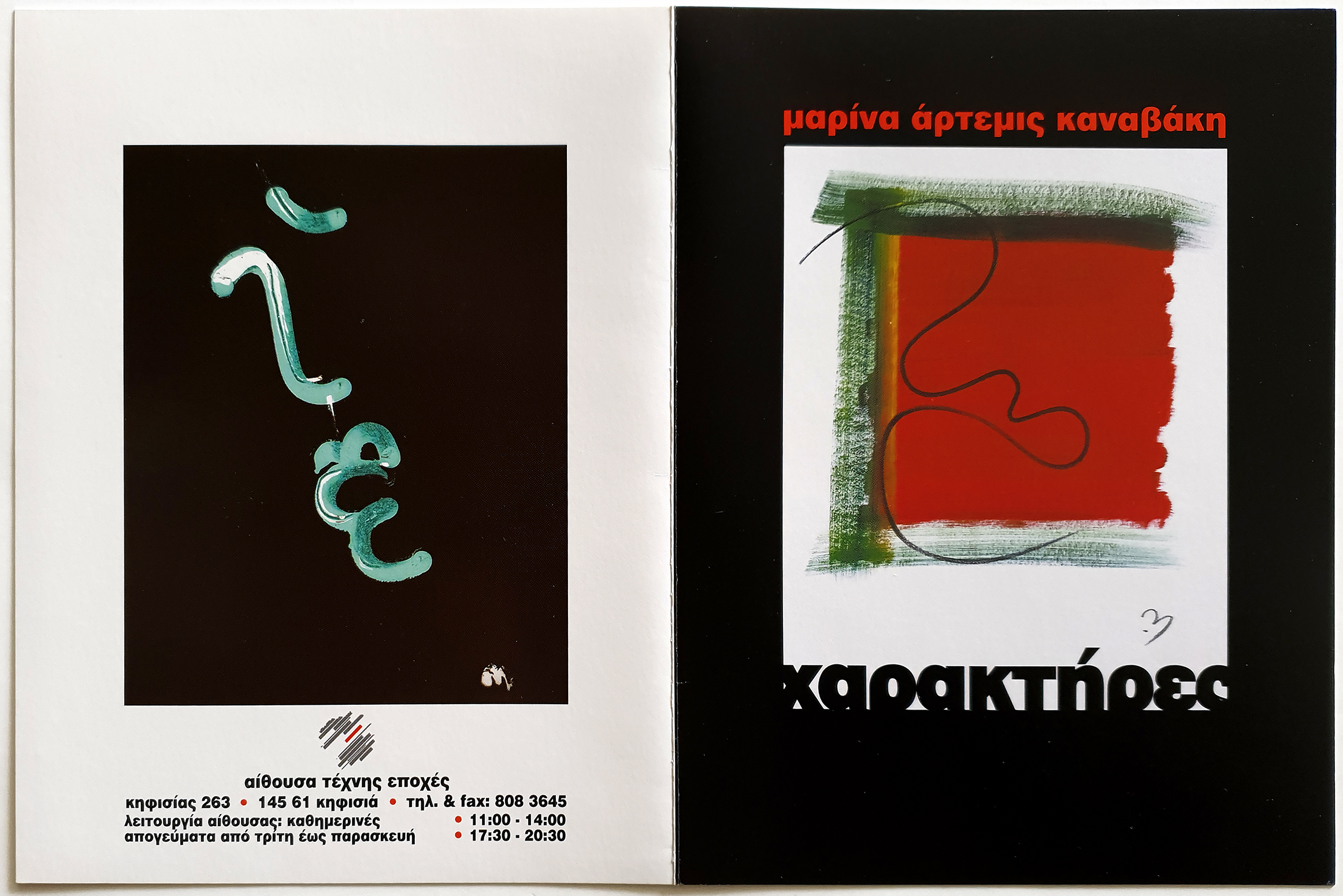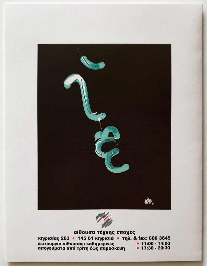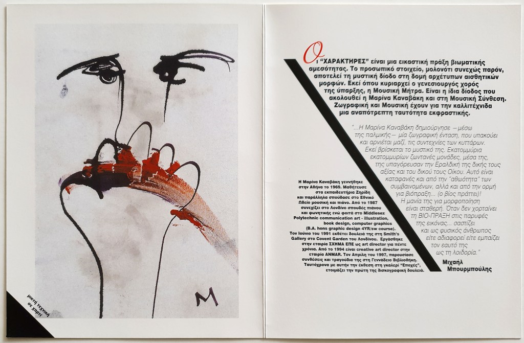 A four page invitation for my painting exhibition at Epohes Gallery, in 1999. The title of the exhibition was “Characters”. The paintings were mainly portrait abstracts, expressive faces, characters. • Τετρασέλιδη πρόσκληση για την έκθεση ζωγραφικής μου στην Αίθουσα Τέχνης Εποχές, το 1999. Ο τίτλος της έκθεσης ήταν “Χαρακτήρες”. Τα έργα ήταν κυρίως αφηρημένα πορτραίτα, εκφράσεις προσώπων, χαρακτήρες.