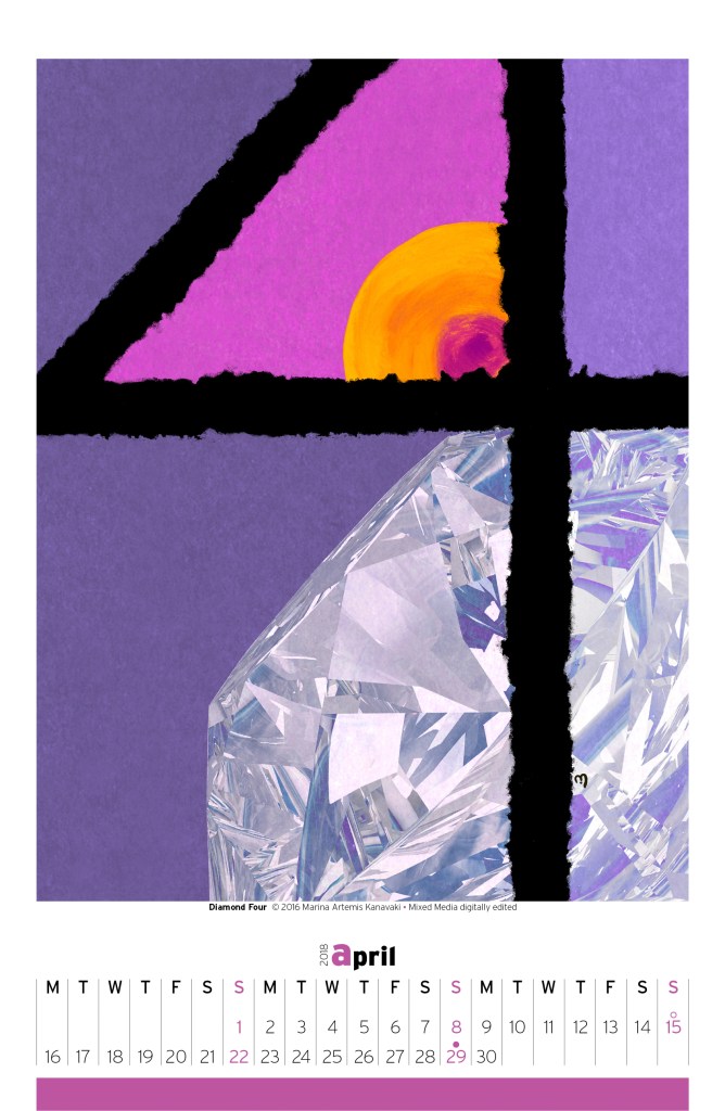 These illustrations were done according to each month’s colors, birthstone and flower. April colors are: pink & purple – flowers: daisy & sweet pea & birthstones: diamond. • Οι εικονογραφήσεις αυτού του ημερολογίου δημιουργήθηκαν με βάση τα χρώματα, τα λουλούδια και τους λίθους του κάθε μήνα. Τα χρώματα του Απριλίου είναι: το ροζ και το μωβ – τα λουλούδια του: η μαργαρίτα και το μοσχομπίζελο και ο λίθος του: το διαμάντι.