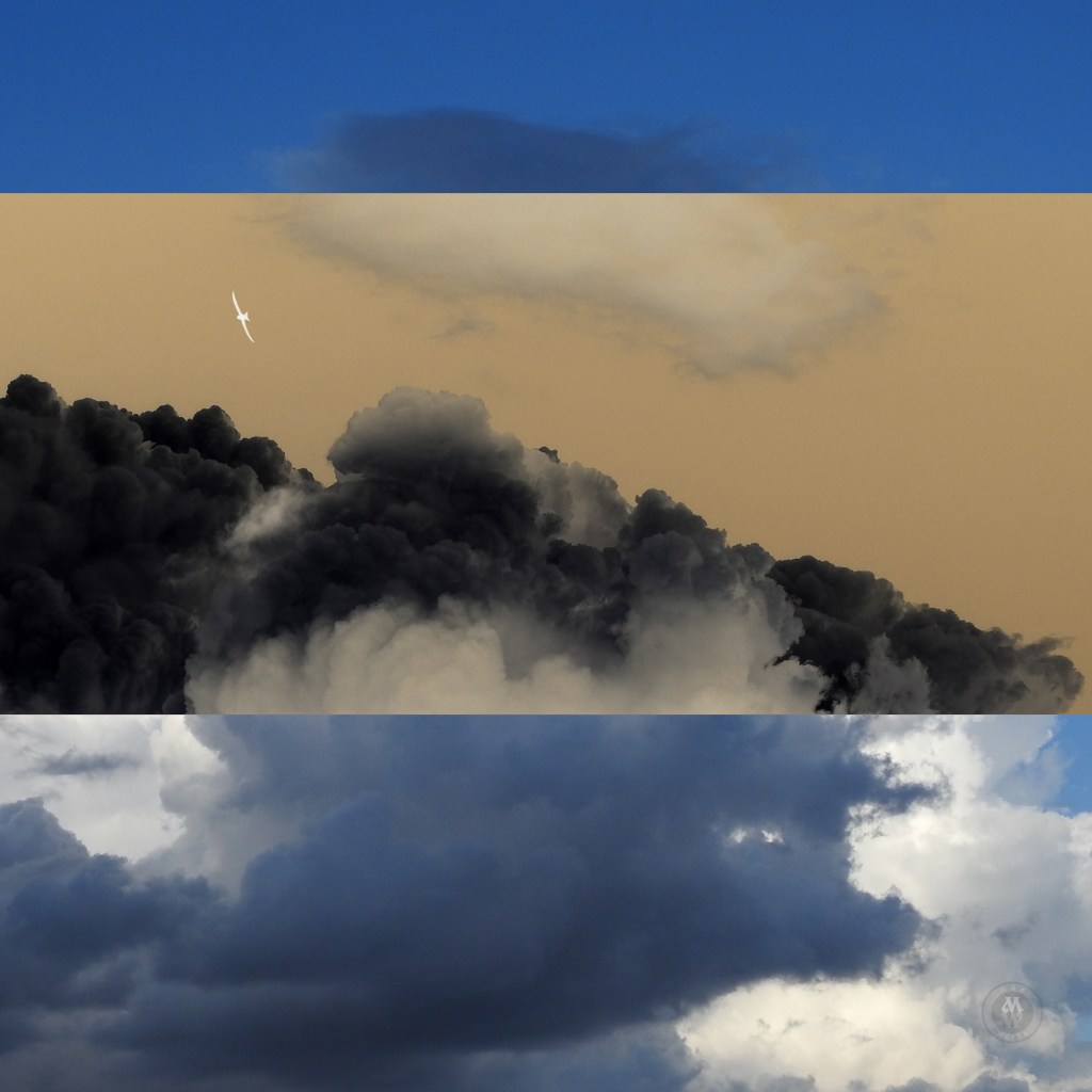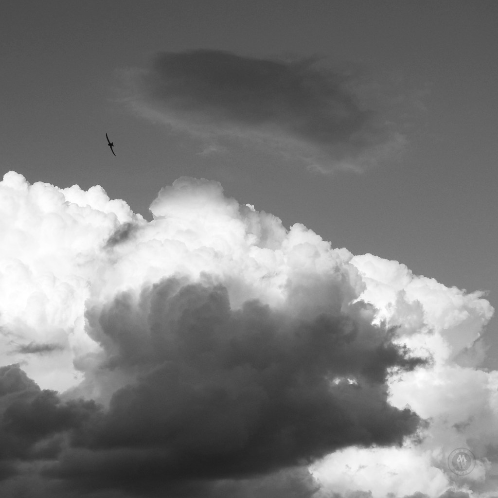 That dark cloud looks like a punk opossum. Beautiful clouds with a solo flight in feathered silhouette. Lovely stacked, inverted off center and not even triptych.