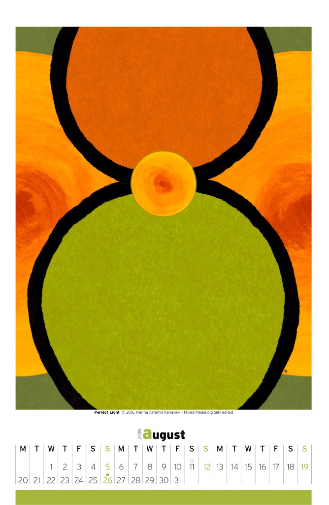 These illustrations were done according to each month’s colors, birthstone and flower. August colors are: orange, red & light green – flowers: gladiolus & poppy and birthstones: peridot & sardonyx. • Οι εικονογραφήσεις αυτού του ημερολογίου δημιουργήθηκαν με βάση τα χρώματα, τα λουλούδια και τους λίθους του κάθε μήνα. Τα χρώματα του Αυγούστου είναι: το κόκκινο, το πορτοκαλί και το ανοιχτό πράσινο – τα λουλούδια του: η γλαδιόλα και η παπαρούνα και οι λίθοι του: το περίδοτο και ο σαρδόνιος.