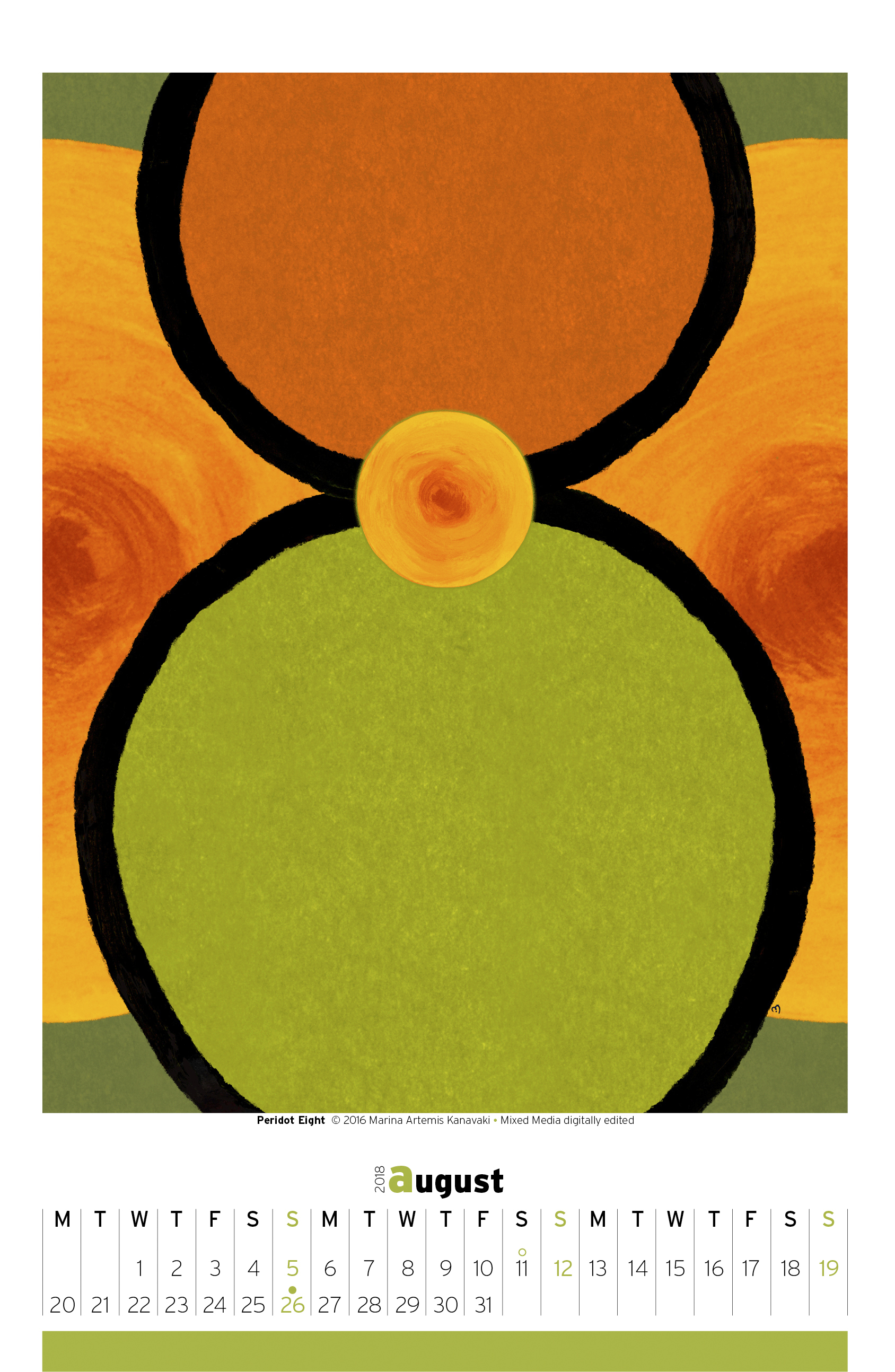 These illustrations were done according to each month’s colors, birthstone and flower. August colors are: orange, red & light green – flowers: gladiolus & poppy and birthstones: peridot & sardonyx. • Οι εικονογραφήσεις αυτού του ημερολογίου δημιουργήθηκαν με βάση τα χρώματα, τα λουλούδια και τους λίθους του κάθε μήνα. Τα χρώματα του Αυγούστου είναι: το κόκκινο, το πορτοκαλί και το ανοιχτό πράσινο – τα λουλούδια του: η γλαδιόλα και η παπαρούνα και οι λίθοι του: το περίδοτο και ο σαρδόνιος.